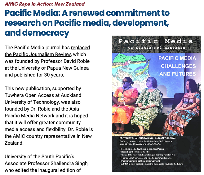 Dr Robie, the AMIC representative for Aotearoa New Zealand, and founding deputy chair of the Asia Pacific Media Network (APMN), and Dr Singh, the Fiji representative, and head of the Journalism Programme at the University of the South Pacific, teamed up for the launch of a new academic journal, Pacific Media.